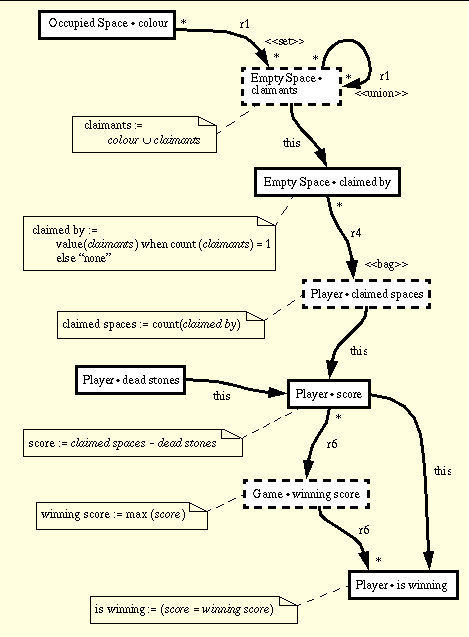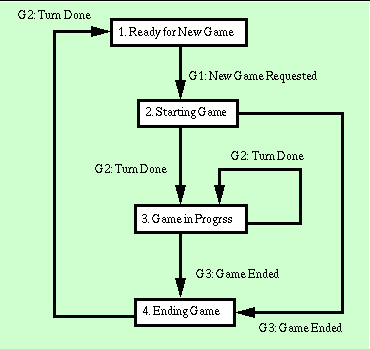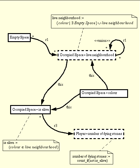 There are 2 active objects in the model: "Game" which models the sequencing of turns (and also kills stones between turns) and "Player", which models the turn.